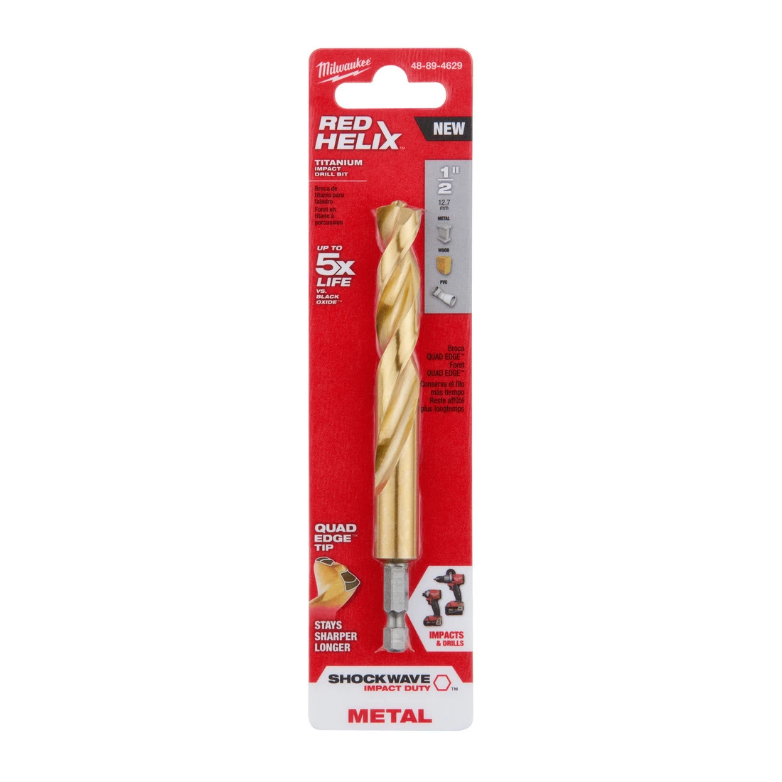 Milwaukee SHOCKWAVE Impact duty titanium drill bits with RED HELIX are engineered for impacts and drills. Designed with a Variable Helix with an aggressive 35 helix angle which ends at 15, the impact duty titanium drill bits with RED HELIX provide Rapid Chip Removal to limit heat buildup to Stay Sharper Longer. The 135 split point tip delivers a precision start and prevents walking for fast, accurate holes. Titanium coating can be used in all drilling applications to give you up to 3X life vs. Black Oxide Drill Bits.